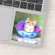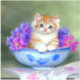Vinheta com um gatinho listrado de cor laranja e branca. Os grandes olhos azuis do gatinho olham para fora enquanto se senta numa tigela azul com flores rosas e roxas. Um presente excelente para amantes de gatos e entusiastas de arte vitorianos!