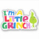 This vibrant and humorous graphic features the self-proclamation: "I'M A LITTLE GRINCH!" The text is rendered in massive, playful, multi-colored block letters that pop against the white background. Standing next to the text is a stylized, bright green cartoon of the Grinch, sporting a mischievous smirk and pointing proudly. This bold, colorful design is perfect for apparel, stationery, or decor for anyone who loves the holidays but needs a cheeky excuse for their occasional bad mood!