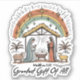 Celebrar o verdadeiro significado do Natal com este adesivo da Natividade com a escritura Matthew 1:21 e a mensagem "Maior Presente de Todos." A design mostra Mary, José e Jesus Bebê sob um estábulo radiante com um arco-íris colorido e estrelas brilhantes acima. Cercado por ovelhas e palmeiras, esta trabalho de arte cheia de fé captura a beleza e a alegria do nascimento do Cristo. Perfeito para decorar garrafas de água, laptop, embalagens de presentes ou cartões de natal, este adesivo de contorno durável está disponível em vários tamanhos e faz uma manutenção de Natal significativa.