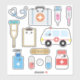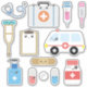 Embalagem com 13 adesivos de equipamento médico e material para o seu pequeno treino médico.