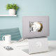 Um gato Ragdoll num pano de fundo da lavanda decidiu que o laptop quente é o lugar que deve ser.