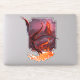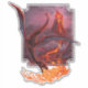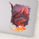 A epic fantasy art apresenta um dragão vermelho respirando um riacho de fogo enquanto um vulcão lança magma a distância. Por Paxdomino