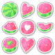 Um doce e fresco vinheta de verão. Fatias de melancia, corações e sementes brilhantes. Cor rosa e verde.