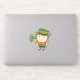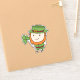 O duende quadrinho vestindo um chapéu e terno verdes, tem uma barba de gengibre e está segurando uma pedra de xamelo sortuda.