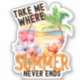 Fuja para o paraíso com este vibrante adesivo "Leva-me onde o Verão nunca termina"! Ele apresenta uma cena de praia impressionante, completa com uma bebida refrescante, palmeiras e flores tropicais, capturando perfeitamente a essência de um verão sem fim. Este adesivo é ideal para decorar laptop, garrafas de água, notebooks e muito mais. É um pequeno paraíso que você pode levar com você aonde quer que vá. Ligue a sua vibração de verão! Veja agora!