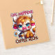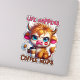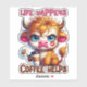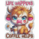 A funny and sarcastic design showcases a cute highland cow sitting with a beautiful white daisy and a to-go coffee cup. The cow, with big blue eyes and a serious expression, sports a lipstick kiss on his cheek and vibrant orange-and-white fur. The colorful text reads, "Life happens, coffee helps." This design is available on various products, making perfect gifts for coffee lovers.
