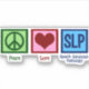 Um adesivo patologista de língua falante que lê PEACE LOVE SLP para um terapeuta de fala que trabalha em patologia de linguagem falada para ajudar outros a falar.