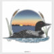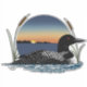 A loon on a lake with a sunset and cattails in a backdrop of blue