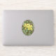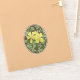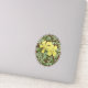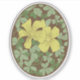 Este adesivo em forma oval apresenta uma ilustração das folhas de sorriso de madeira e flores. Dois tons de verde para as folhas são complementados por linhagem marrom. Um estilo de bloco de madeira dá a esta trabalho de arte uma qualidade única e artesanal. Este adesivo é perfeito quando você gostaria de trazer um toque de natureza rústica para sua casa. Disponível em flores violetas ou amarelas. Da obra de arte original de Carolyn A Pappas.