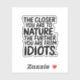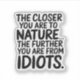 Fuja do agito e do barulho e abrace a tranquilidade da natureza com este adesivo espirituoso! Com a frase "Quanto mais perto você está da natureza... Mais longe você está dos idiotas", este adesivo é perfeito para entusiastas de atividades ao ar livre, introvertidos ou qualquer pessoa que prefira a companhia das árvores às pessoas. Cole-o no seu laptop, garrafa de água, equipamento de trilha ou em qualquer lugar que você queira expressar seu amor pelo mundo natural e um toque de humor sarcástico. Este adesivo de vinil durável foi feito para resistir aos elementos, assim como o seu espírito aventureiro.