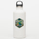 A hexagonal vintage travel badge inspired by the Manuxet River and its tidal marshlands near Innsmouth, depicting a calm aerial view of coastal wetlands leading toward the sea.