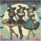 Um trio de lindas bruxas vintage andando de mãos dadas