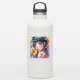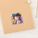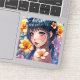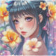 Linda garota com olhos roxos e cabelo escuro cercado por narcisos amarelos. Bonito floral e anime com tema arte digital ai.