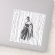 Esta é uma ilustração de moda preto-e-branco elegante que apresenta uma mulher confiante em um vestido dramático com ombro caído, com enfeites florais intrincados e uma capa fluída e transparente. O fundo tem uma textura de linha vertical impressionante, adicionando um senso de profundidade e movimento