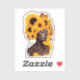 Belo adesivo de uma mulher afro-americana adornada com girassóis no cabelo, simbolizando beleza, força e positividade. Um trabalho de arte afrocêntrico radiante que celebra as mulheres, a natureza e o orgulho cultural. É um presente ideal para mulheres, amantes de girassol, e para qualquer pessoa que aceite empoderamento, amor próprio e patrimônio. Perfeito para aniversários, Dia das Mães, Mês da História Negra e inspiração diária.