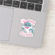 Um adesivo giro e giro de tubarão com o texto "nenhum latido morde". O tubarão tem olhos grandes e está vestindo um arco rosa. O fundo é azul claro com bolhas.