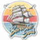 Ilustração retrorativa com design de texto de "Nascer para velejar" e navio à vela no pôr do sol na decoração do mar