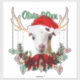 Cabra linda de LaMancha com seu chapéu de Papai Noel e galhadas adornada com Enfeites de natal listrados vermelhos e verdes, cercada por uma coroa de natal de poinsettias vermelhas, cones de pínus, verde e um grande arco vermelho. Adicione seu próprio texto. A © GatdLady GetYerGoat™ original