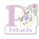 Personalize qualquer item com um Nome e Inicial com o adesivo Floral Design Recort-Out. O nome de exemplo é Petunia.