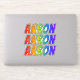 Este design de adesivo divertido, multicolorido e excitante apresenta o nome comum ou o nome próprio "AARON", com as letras do nome a terem um espectro colorido do arco-íris como um padrão de coloração gradiente. Pode ser um presente divertido dar a alguém cujo nome é Aaron. [~Z0000361]