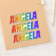 Este design de adesivo vibrante e multicolorido apresenta o nome comum ou o nome próprio "ANGELA", com as letras do nome com um espectro colorido do arco-íris inspirado num padrão de coloração gradiente. Pode ser um presente divertido dar a alguém chamado Angela. [~Z0000361]