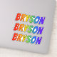 Este design de adesivo divertido, multicolorido e excitante apresenta o nome comum ou o nome próprio "BRYSON", com as letras do nome que apresentam um espectro colorido do arco-íris como um padrão de coloração gradiente. Pode ser um presente divertido dar a alguém chamado Bryson. [~Z0000361]