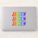 Esse design multicolorido, excitante e vibrante adesivo apresenta o nome comum ou o nome próprio "JAYDEN", com as letras do nome tendo um espectro colorido do arco-íris como padrão de coloração gradiente. Pode ser um presente divertido dar a alguém chamado Jayden. [~Z0000361]