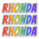 Este design multicolorido, vibrante e excitante adesivo apresenta o nome comum ou o nome próprio "RHONDA", com as letras do nome tendo um espectro colorido do arco-íris inspirado num padrão de coloração gradiente. Pode ser um presente divertido dar a alguém chamado Rhonda. [~Z0000361]
