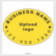 Um adesivo de vinil de forma oval grande que você pode personalizar para colocar seu número de telefone comercial para clientes ou clientes que o encontrem facilmente quando precisarem ligar para você para fazer seus pedidos ou fazer perguntas sobre seus produtos ou serviços. Exiba-o como material de marketing para anunciar sua empresa ou para promover seu nome de marca. Você também pode usá-lo como acessório de material de embalagem para grandes caixas. Adesivo de vinil personalizável que pode ser utilizado para criar reconhecimento do nome da marca. As cores design são textos pretos sobre fundo amarelo. Para personalizar este adesivo, carregue o logotipo da sua empresa, digite o nome da sua empresa e o número de telefone. Após carregar o logotipo e digitar textos, verifique a aparência. Se a aparência lhe agrada, você pode colocar seu pedido agora. Se precisar redimensionar e mover o logotipo e as mensagens para o ajustado neste adesivo ou no tamanho que você escolher, mude na ferramenta design. Você também pode alterar a cor do plano de fundo, a cor da fonte e o estilo da fonte na ferramenta design.