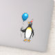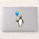 O pinguim está segurando um balão azul e tem um chapéu de festa em sua cabeça, então ele está pronto para a festa.