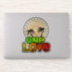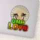 Arte gráfica de uma silhueta de duas palmeiras com o sol brilhando atrás e as palavras Um Amor
