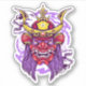Esta ilustração vibrante apresenta uma máscara de oni japonesa feroz, um demônio tradicional ou figura de ogro. A máscara é predominantemente vermelha, com dentes agudos e olhos brilhantes. Um capacete ouro enfeitado com chifres senta-se sobre a máscara, e longos e fluentes cabelos roxos enroscam o rosto. Em ambos os lados da máscara, estão posicionados dois crânios, somando-se à atmosfera ameaçadora. O fundo é uma mistura giratória de preto, branco e roxo, criando uma composição dinâmica e energética.