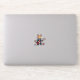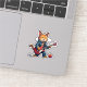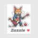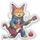 A graphic image of a orange cat playing guitar wearing a denim outfit.