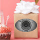 Auto-falante de música branca e preta numa parede rachada