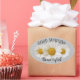 Três margaridas brancas com o texto "Bom dia lindo" em fundo de cinza. O texto pode ser editado, para que você possa substituir a palavra "Lindo" por um nome, por exemplo.