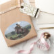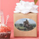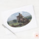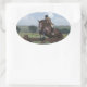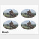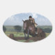Este adesivo Oval apresenta um trabalho de arte digital original de um cavalo e cavalgando sobre um portão de fazenda, criado em Vue pelo artista Jayne Wilson.