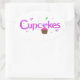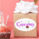 Um adesivo divertido com a palavra cupcakes e um doce design cupcake com pequenos corações no fundo.