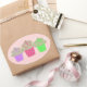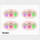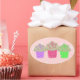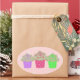 Cupcakes de cor clara, roxos, cor-de-rosa e verdes, com invólucros de bolinhas. Um fundo divertido de bolinhas brancas e cor-de-rosa macia.