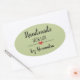 Um adesivo oval moderno "feito à mão com amor" com uma letra preta num fundo verde sábio embelezado por um coração vermelho giro. Personalizar texto.