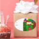 Um elfo fofo ou conhecido como auxiliar de papais noeis. Vestido com um terno verde brilhante e chapéu. Um grande grupo de presentes festivamente embrulhados ao seu redor. Personalizar conforme desejado.