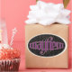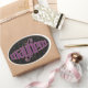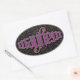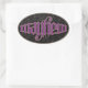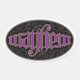 A palavra "Mayhem" como ambigrama num ornamentado de oval. Ambigramas são palavras que podem ser invertidas e ainda assim lidas da mesma maneira.