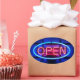 Oval sticker with an image of a blue and red neon “open” sign on black. The back is black with customizable text. See the entire Tubular 80s Sticker collection in the INVITES | Stickers & Labels section.