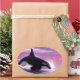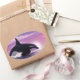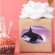 Pintura digital de uma órca quebrando em frente a um pôr do sol rosa.