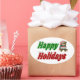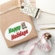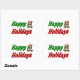 Pinheiros com feriados felizes em textos verdes e vermelhos 3D e um ursinho de pelúcia com presente. Os adesivos estão disponíveis em várias formas.