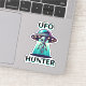 Alienígena e gráfico de OVNI para aqueles na OVNIlogia. Uma alienígena fofa sendo derrubada de um OVNI. Texto diz, "Caçador de OVNI" em autocolantes pretos e turquesas.