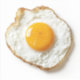 A imagem mostra um ovo frito perfeitamente cozido, com uma gema ouro e brilhante no centro, cercado por bordas estaladiças e crocantes e um branco liso. Levemente temperado com pimenta preta, o ovo se senta sobre um fundo branco, destacando suas cores vibrantes e textura.