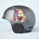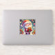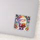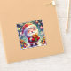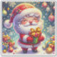 Um Papai Noel alegre, com um sorriso grande e bochechas rosadas, fica em meio a um arranjo colorido de presentes e ornamentos de férias.