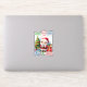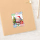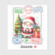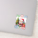 Um belo adesivo de Natal mostra um Papai Noel alegre segurando uma bebida quente, cercado por caixas de presentes coloridas e ornamentos vibrantes.