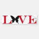 Um amortecedor divertido para amantes de borboletas com a palavra amor em letras grandes e vermelhas e uma silhueta de uma borboleta de cauda-andorinha substituindo o O.