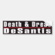 Texto branco grande a preto. Fácil de ler à distância. Refere-se a sua má manipulação do Covid e outros problemas na Flórida. "Morte e Pão Desantis." Do Balance America.